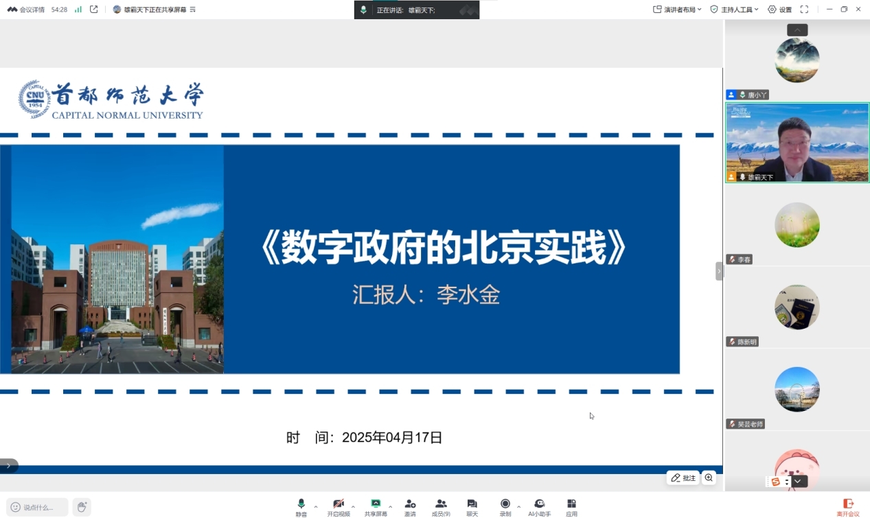 2025年04月17日下午,太阳成集团tyc234cc官网数字政府科研团队就《数字政府的北京实践》科研项目进展进行线上学术研讨。本次学术研讨会主要由李水金教授介绍《数字政府的北京实践》科研项目写作的基本情况,数字政府科研团队成员进行修改意见交流研讨,最后由谢新水教授进行总结。本次学术研讨会由李水金教授主持,谢新水教授、龙玉其教授、张丽娜副教授、吴芸副教授、李春副教授、陈新明副教授以及数字政府科研团队其他研究生成员等参加此次学术研讨会。