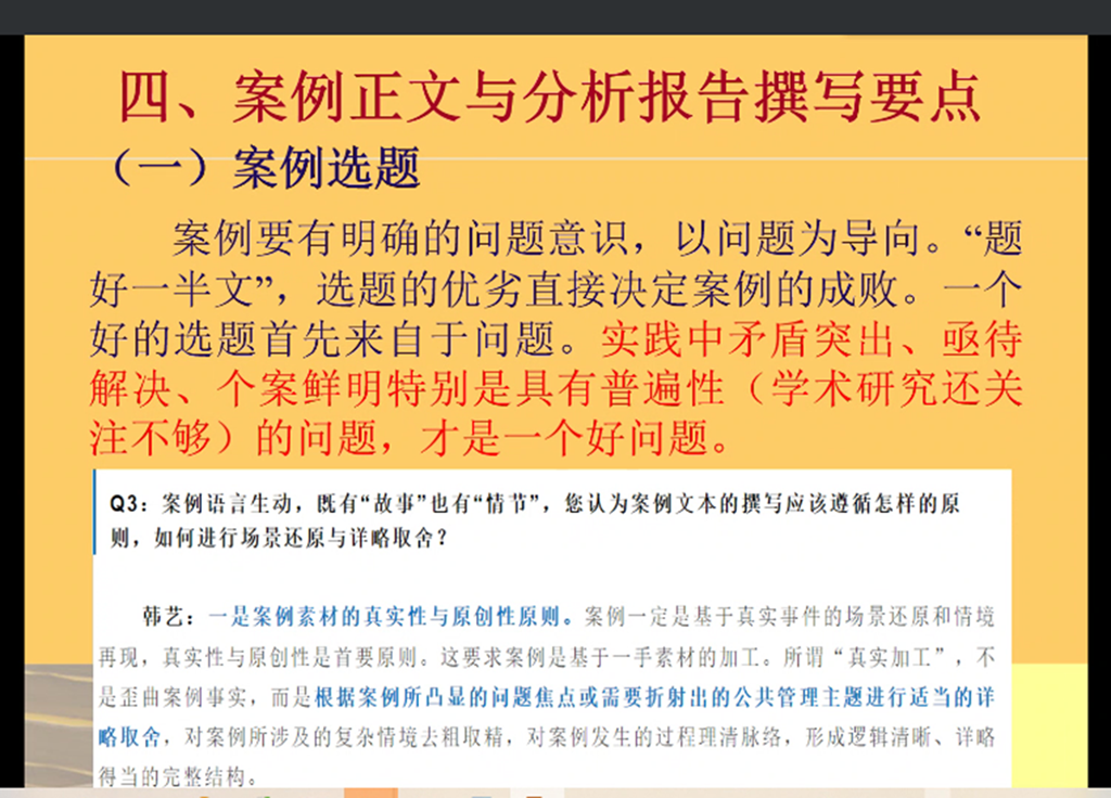 2021年6月10日晚上,南昌大学公共太阳成集团tyc234cc官网博士生导师韩艺教授,应邀为我院师生做了一场生动活泼的关于案例大赛的讲座——《公共管理案例编写与案例大赛的几点体会》。韩教授从第四届中国研究生公共管理案例大赛的专家评审经验与第五届案例大赛“最佳指导老师”的指导经验出发,分享了公共管理案例编写与参加案例大赛的经验。讲座由MPA中心李春副教授主持。按照常态化疫情防控要求,本次讲座采用视频会议形式举行。