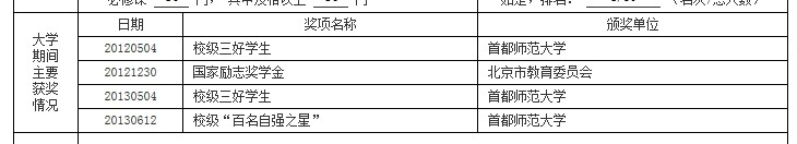 3)同一奖项的获奖日期应一致,如校级奖学金日期统一填写XX年12月1日;校级三好学生或优秀班干部的时间统一填写XX年5月4日;