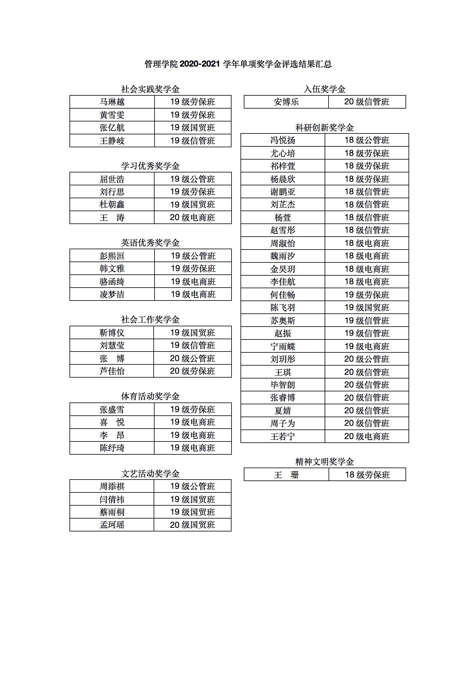 现将太阳成集团tyc234cc官网2020-2021学年单项奖学金评选结果公示如下,优秀奖学金请在学工系统内查询。此结果同时可在学工系统(主页-服务门户-学工系统)内查询。公示期结束后,此结果将提交至学校进行校级评审,最终评审结果以学校评审为准。