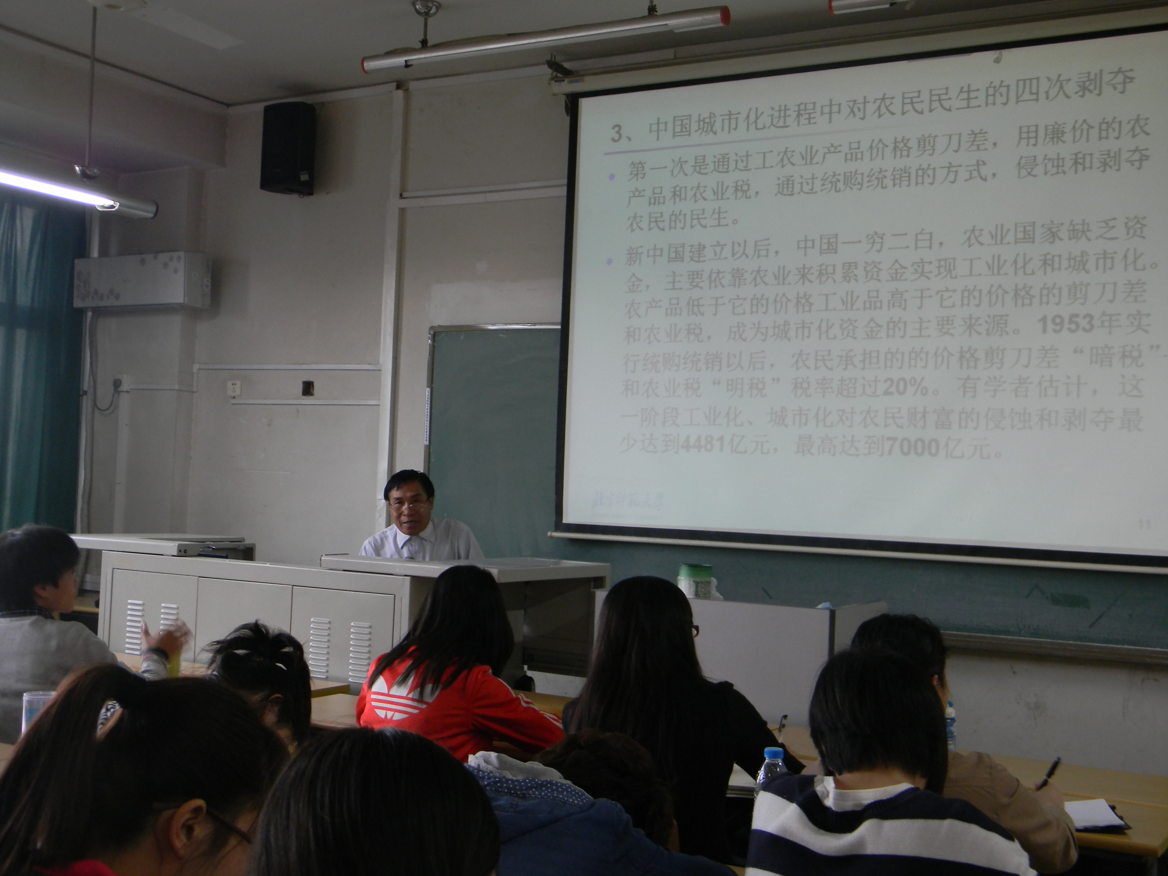 唐任伍教授在讲座中提出城市是为了改善民生而产生,城市化是民生改善和发展的产物,并通过分析诺瑟姆曲线分别讲解了城市化进程的初级、加速和成熟三个阶段的不同特点。唐任伍教授指出,随着经济社会的不断发展与进步,新中国城市化发展也经历了起步、停滞、探索和发展四个阶段。他认为,中国城市化进程通过“价格剪刀差”、“资源剪刀差”、“人才剪刀差”、“土地剪刀差”对农民民生进行了四次剥夺,并深刻分析了这四次剥夺产生的原因、过程和结果。最后,唐任伍教授提出必须清醒认识到新型城镇化带来机遇的同时也带来了巨大的民生隐忧。表现为:民生基础动摇的隐忧;民生支撑条件削弱的隐忧;民生质量降低的隐忧;民生权利被蚕食的隐忧。唐任伍教授的讲座充满了激情和关怀精神,获得同学们的高度好评,同学们对中国新型城镇化有了更深刻的了解,特别是对新型城镇化过程中民生改善的隐忧有了更深刻的认识。