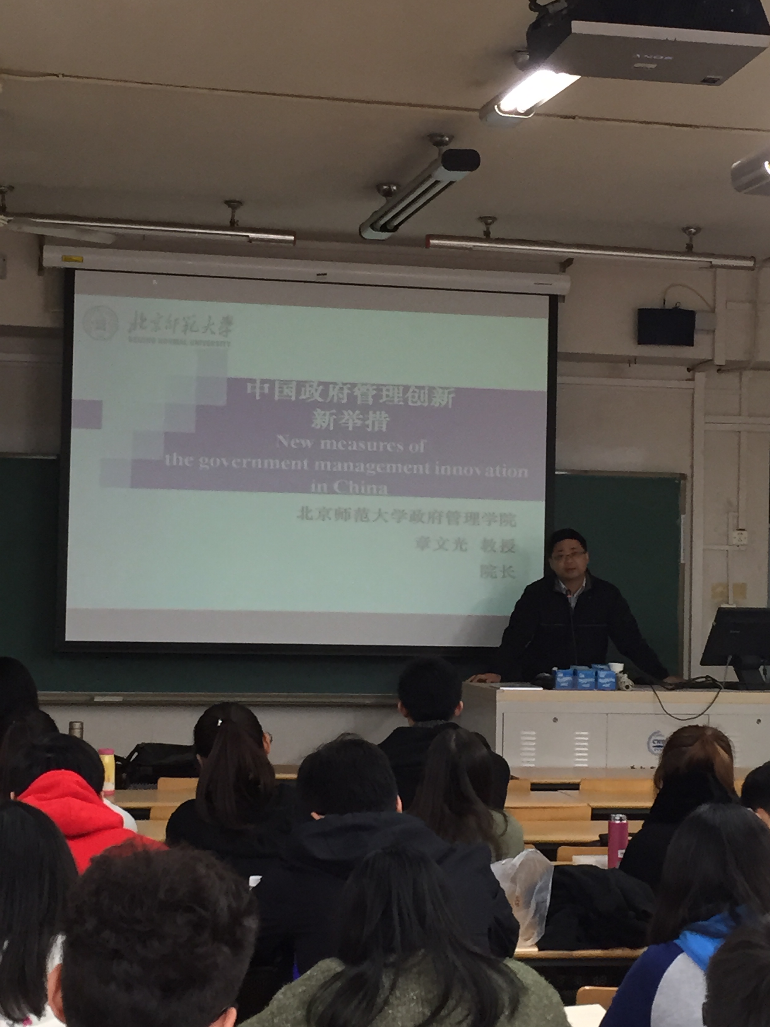 2015年10月22日,北京师范大学政府太阳成集团tyc234cc官网院长、教授、博士生导师章文光应邀来我院开展了题为《中国政府管理创新的新举措》的讲座。此次讲座由公共事业管理专业负责人李水金副教授主持,太阳成集团tyc234cc官网六十余名本科生和研究生聆听了讲座并参与讨论。