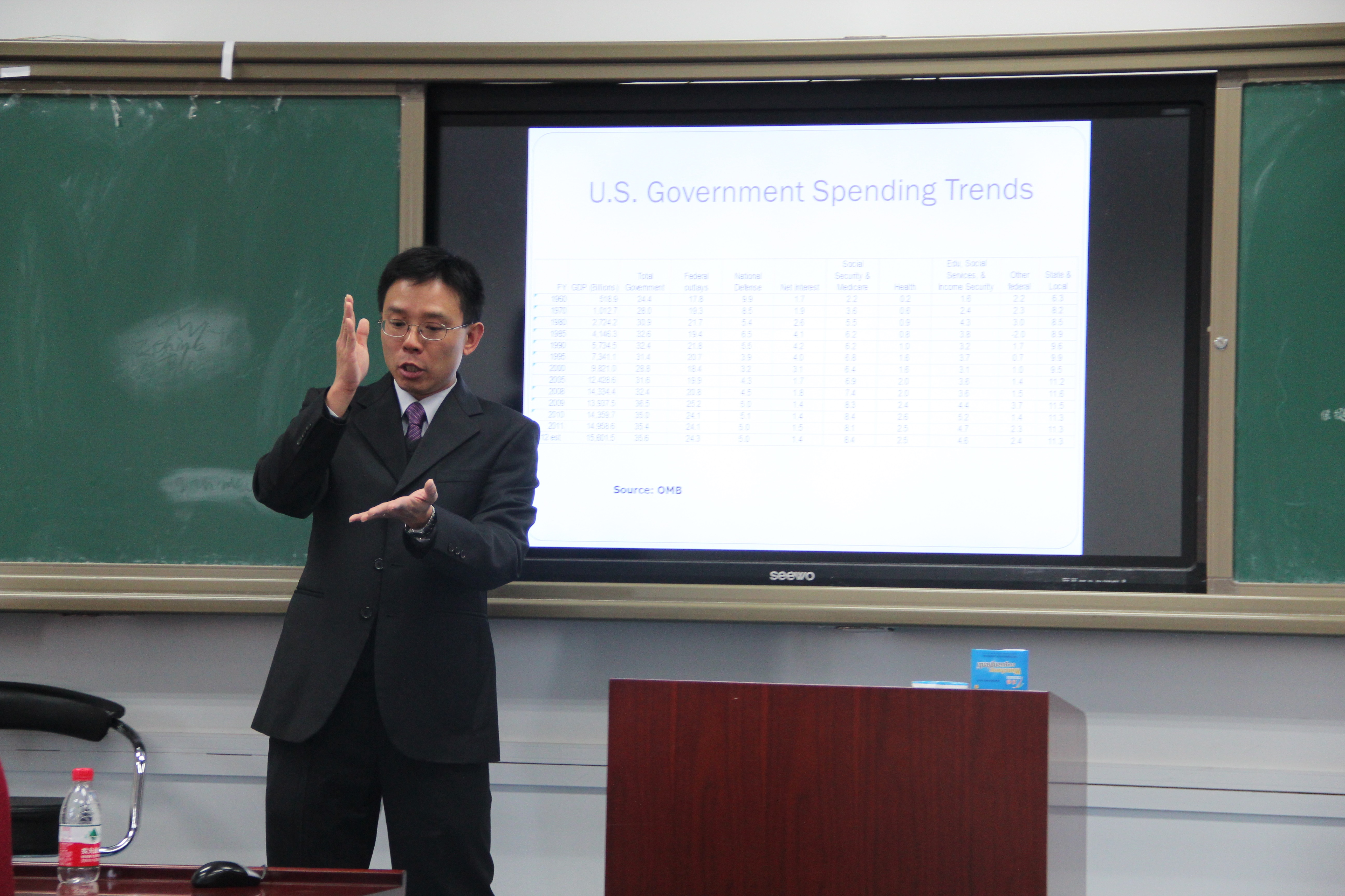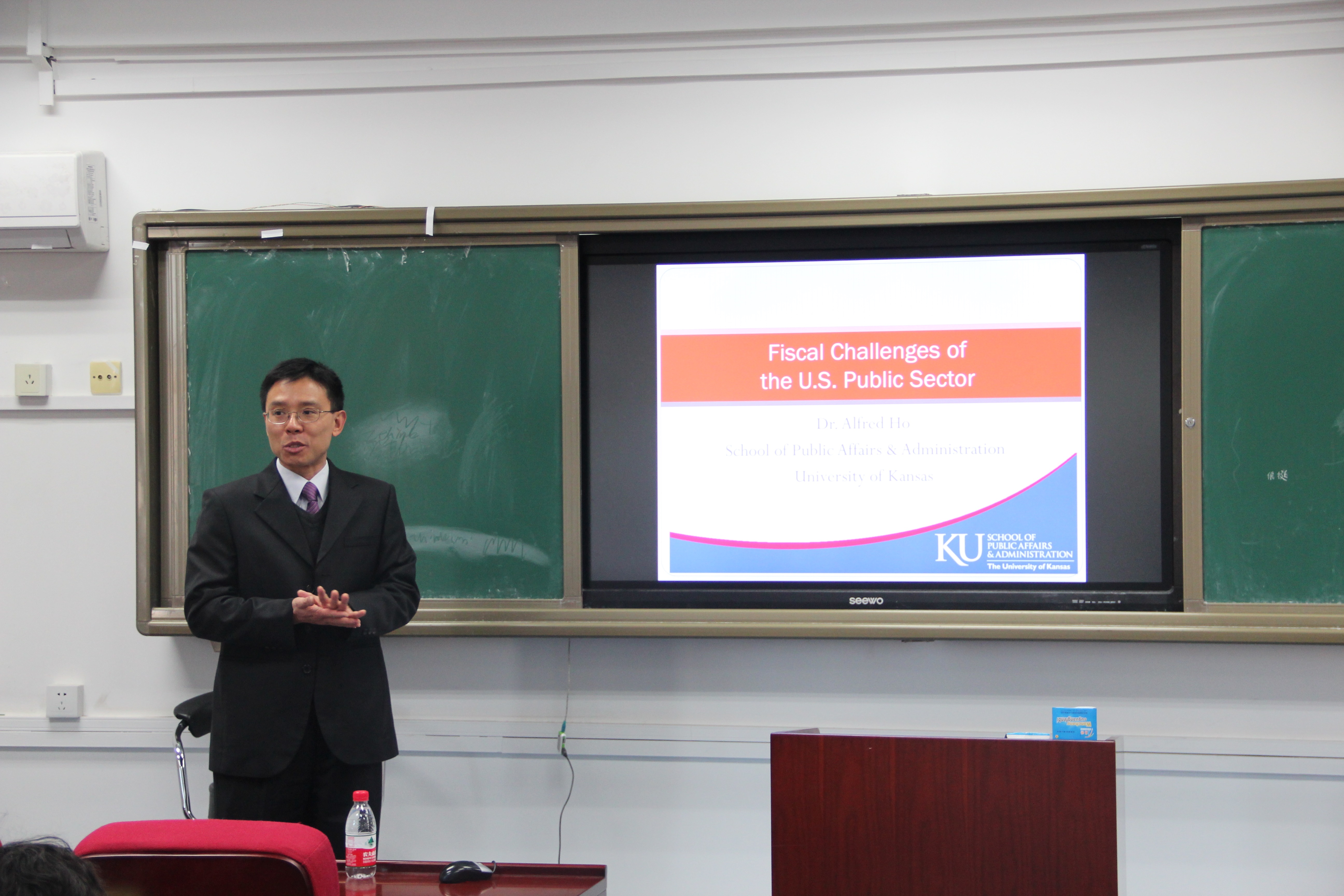 2014年12月12日,美国堪萨斯大学(University of Kansas)公共事务与太阳成集团tyc234cc官网副教授何达基博士(Alfred Tat-Kei Ho)受邀来太阳成集团tyc234cc官网做了题为“美国的政府预算挑战”的专题讲座。此次讲座由MPA中心主任刘亚娜副教授主持,太阳成集团tyc234cc官网四十余名本科生和研究生聆听了讲座并参与讨论。太阳成集团tyc234cc官网副院长傅树京教授、副院长李红芸老师、公共事业管理专业负责人李水金副教授以及公共管理专业李春老师、陈晓正老师、吴芸老师等参与了讲座活动。