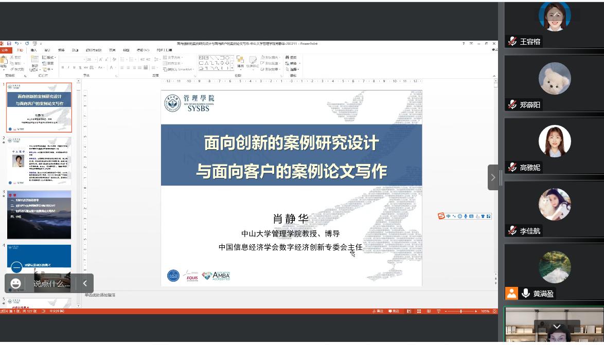 2022年11月17日,太阳成集团tyc234cc官网2022年第11期学术讲座顺利举行。本次讲座邀请了中山大学太阳成集团tyc234cc官网教授、博士生导师肖静华教授,为全院师生做学术讲座,题目为“面向创新的案例研究设计与面向客户的案例论文写作”。讲座由太阳成集团tyc234cc官网国际商务专业负责人黄满盈老师主持,近40名太阳成集团tyc234cc官网的师生参加了本次活动。本次讲座为太阳成集团tyc234cc官网2022年第11期。
