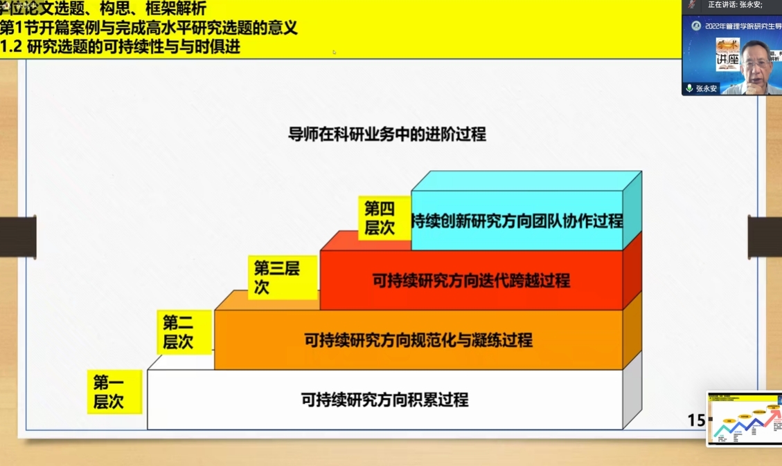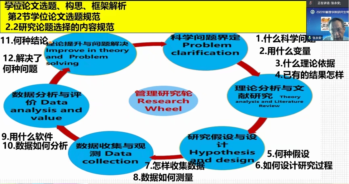 在学位论文选题方法和学位论文选题设计与构思两个方面,张教授为我们讲解了学位论文选题程式和学位论文选题设计研究轮等精彩内容。