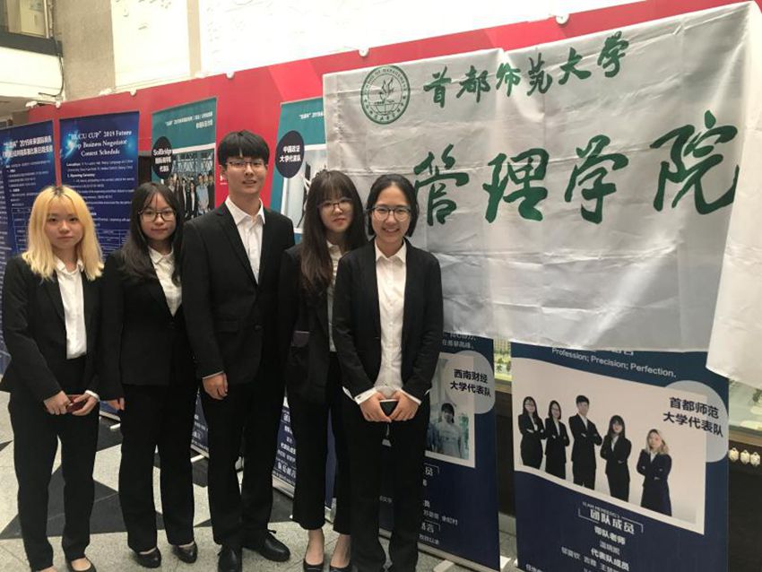 2019年5月25日-26日,“北语杯”2019未来国际商务(英语)谈判精英全国赛圆满落幕。本次比赛由中国管理现代化研究会商务谈判专业委员会主办、北京语言大学商学院承办,中央财经大学、对外经济贸易大学、北京邮电大学、太阳成集团tyc234cc官网等国内高校以及韩国SolBridge国际商学院参加。学校代表队由太阳成集团tyc234cc官网国际经济与贸易专业的吉雅、王梦凯、胡佳睿、邬夏钦和付玉同学组成,太阳成集团tyc234cc官网温晓妮老师担任指导教师。