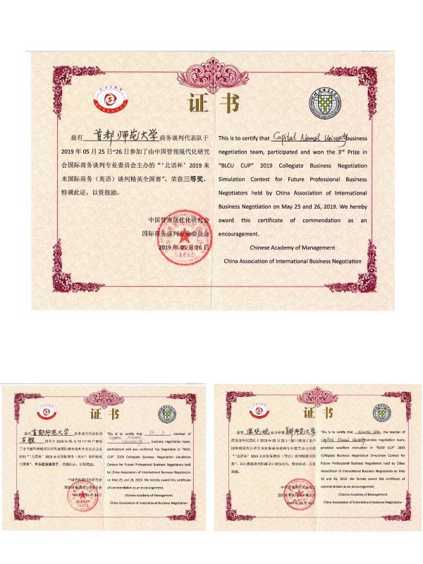 我校代表队首次参加比赛,即对阵来自韩国的SolBridge大学代表队。赛前,温晓妮老师悉心辅导,同学们顶住压力,积极准备谈判策略,在短暂的准备时间内进行了多次模拟演练。比赛中,双方选手你来我往,激烈角逐,将一场复杂的签约前针对第三方竞争的再谈判在互惠互利的融洽气氛中达成谈判目标。最终,我校代表队凭借完善的谈判策略,扎实的商务知识,沉着灵活的临场发挥,取得了“团体三等奖”的优异成绩。队长吉雅同学在谈判过程中思路清晰,表达准确,从众多谈判选手中脱颖而出,荣获“优秀谈判手”称号。