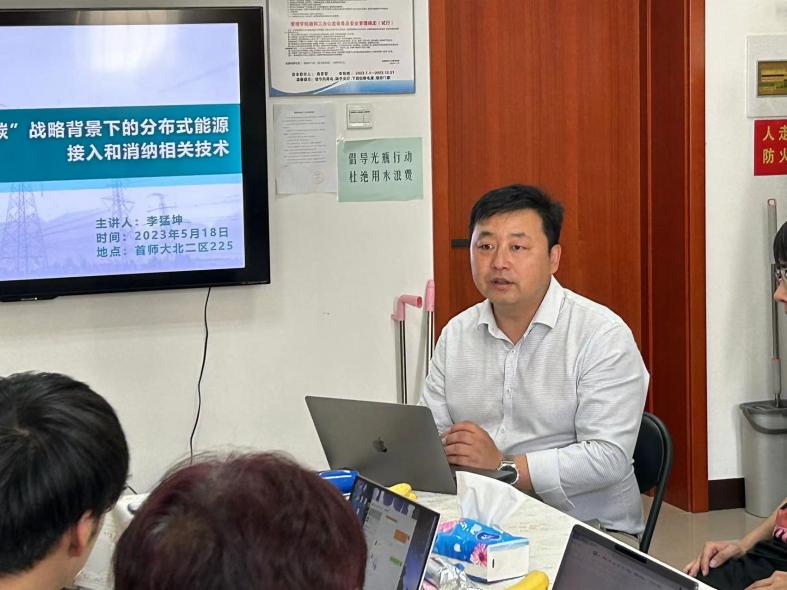 为了更好地理解国家双碳战略,了解分布式能源学术前沿和行业动态,促进教学和科研的融合,深入开展面向国家和企业需求的科研,推进课程思政建设,公共管理信息化理论与技术学科于2023年5月18日承办太阳成集团tyc234cc官网2023年第3期(总第14期)学术沙龙,张媛老师主持活动,李猛坤老师分享了“双碳”战略背景下的分布式能源接入和消纳的相关技术研究,太阳成集团tyc234cc官网党委书记纪高峰以及10余位师生参与讨论交流。