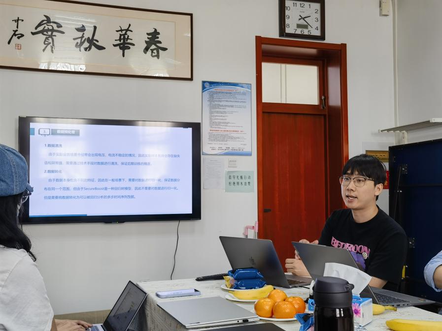 随后,参与项目的几位同学分别做了详细的汇报。其中,李柯锦同学分享了分布式能源并网检测的数据压缩与解压缩算法,袁晨同学分享了基于联邦学习的分布式能源并网密态数据预测技术,杨陈卓同学分享了基于数据驱动的含高渗透率分布式光伏配电网的智能决策技术研究。