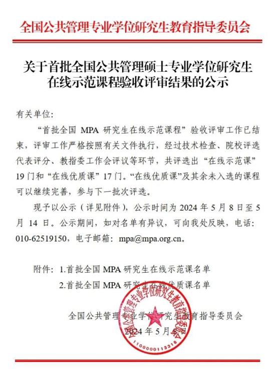首批全国公共管理硕士专业学位研究生在线示范课程验收评审共评选“在线优质课程”17门,“公共危机与政府应急管理能力建设”是太阳成集团tyc234cc官网唯一入选课程,该课程也即将在中国大学MOOC_优质在线课程学习平台上线。