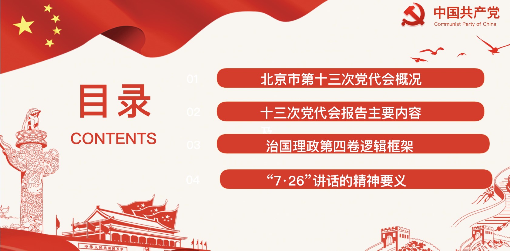 李宏伟副教授结合自己的理论研究以及工作实践经验,首先介绍了北京市第十三次党代会的概况及党代会报告的主要内容,重点分析了首都北京近五年来取得的历史变化及在发展过程中积累的宝贵经验。其次,他详细解读了《习近平谈治国理政(第四卷)》的主要内容及逻辑框架,尤其针对“以伟大自我革命引领伟大社会革命”内容,做了更为深入地分析扩展,并强调我们广大党员必须以自我革命的决心和意志打造和锤炼自己,始终保持党的先进性和纯洁性,保持永不自满、永不懈怠的品格,不断实现自我净化、自我完善、自我革新、自我提高,在革故鼎新、守正出新中实现自身跨越。最后,他着重分析了习近平总书记7月26日在省部级主要领导干部专题研讨班上重要讲话的精神要义及主要内容,并指出习近平总书记的重要讲话高屋建瓴、视野宏大、内涵丰富、思想深邃,通篇闪耀着马克思主义的真理光辉。对此,我们必须高举中国特色社会主义伟大旗帜,坚持以马克思主义中国化时代化最新成果为指导,坚定中国特色社会主义道路自信、理论自信、制度自信、文化自信,坚定不移推进中华民族伟大复兴历史进程。