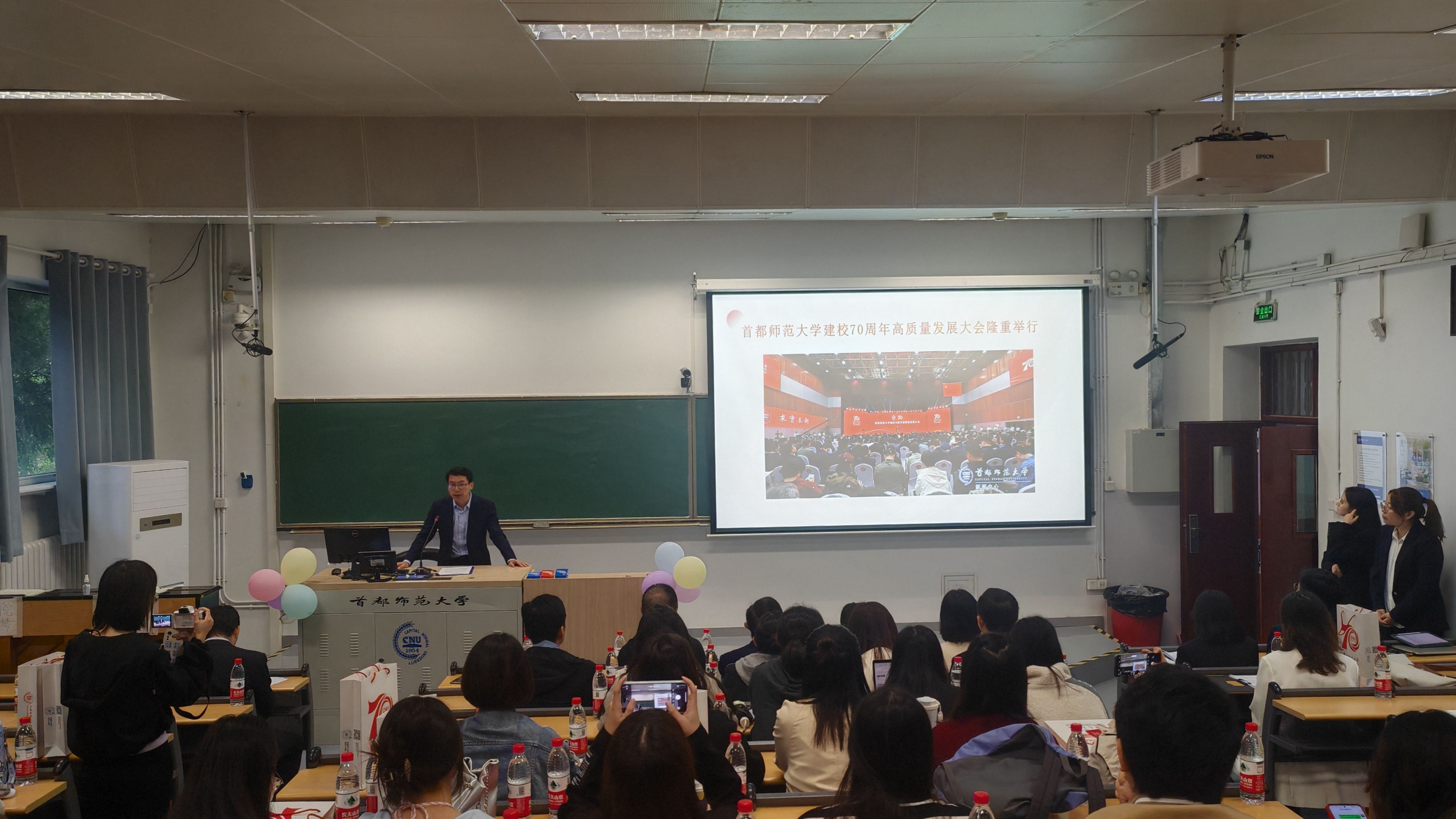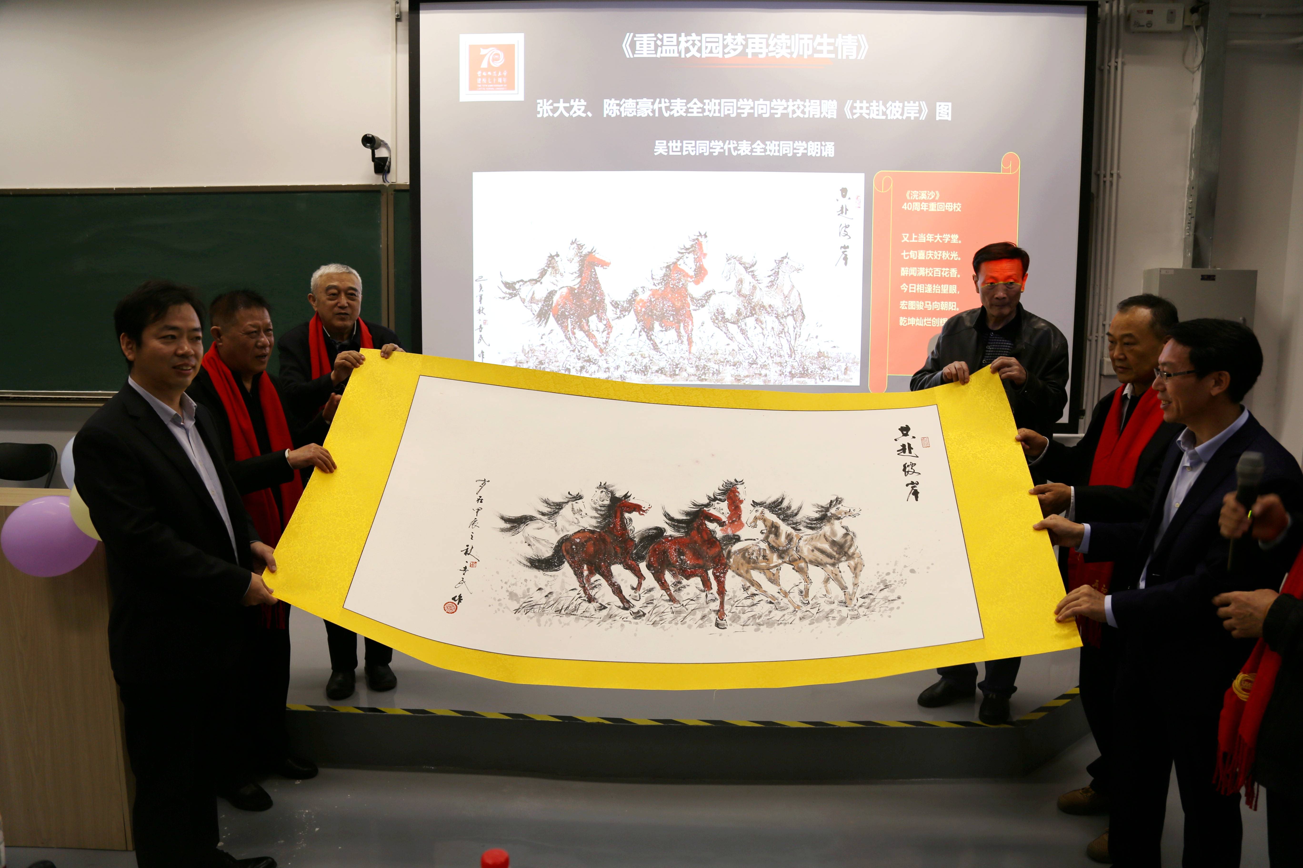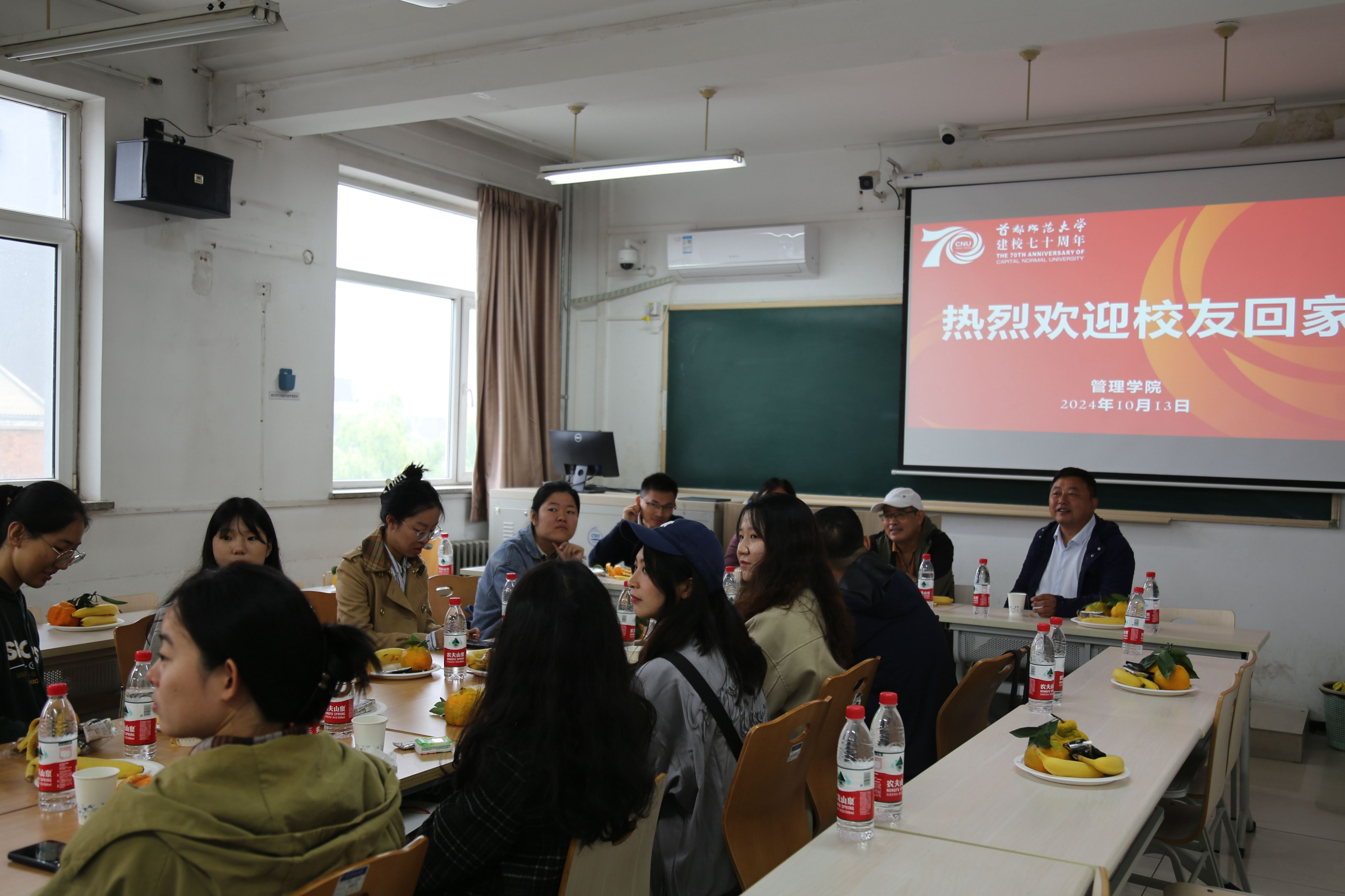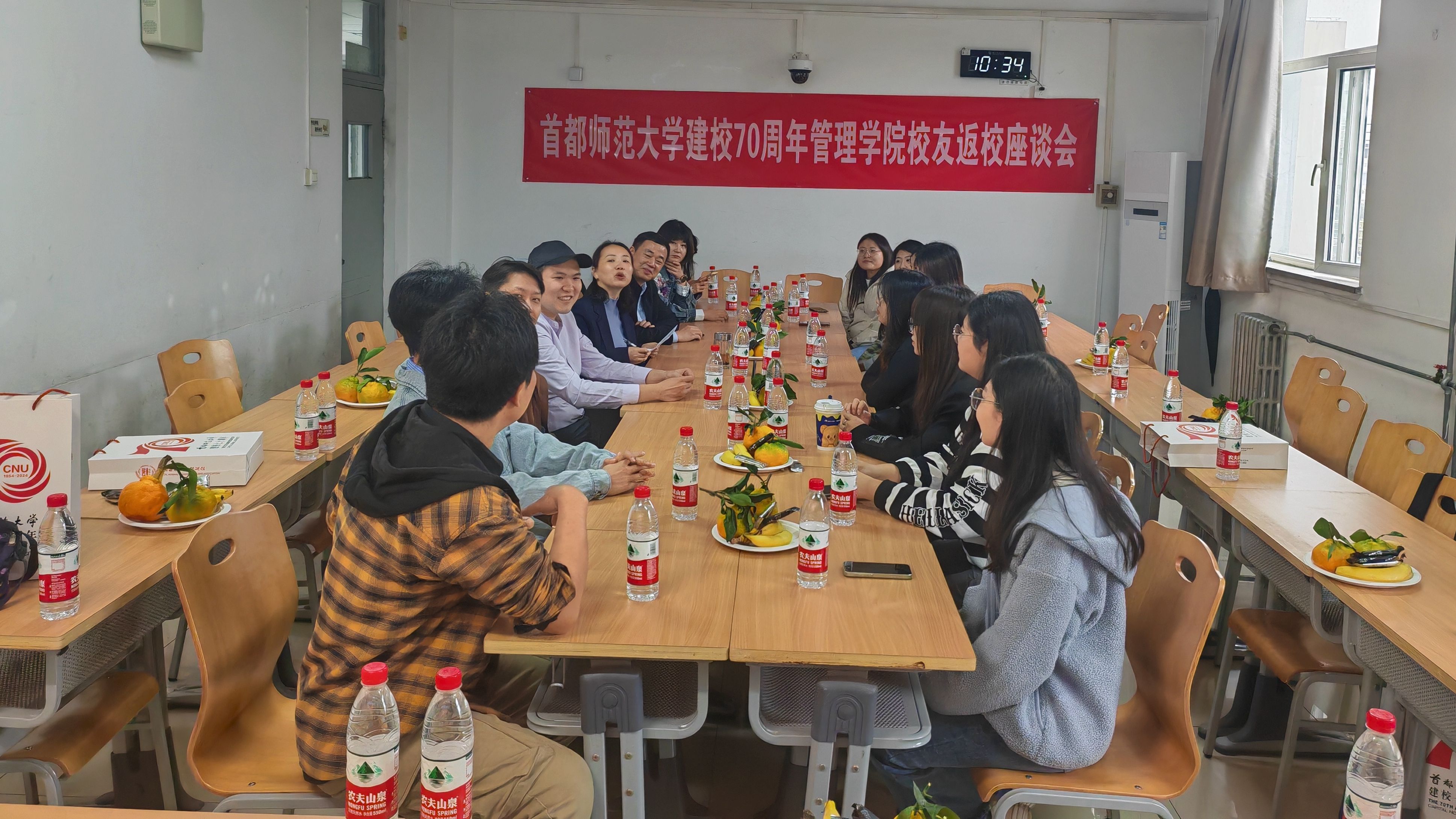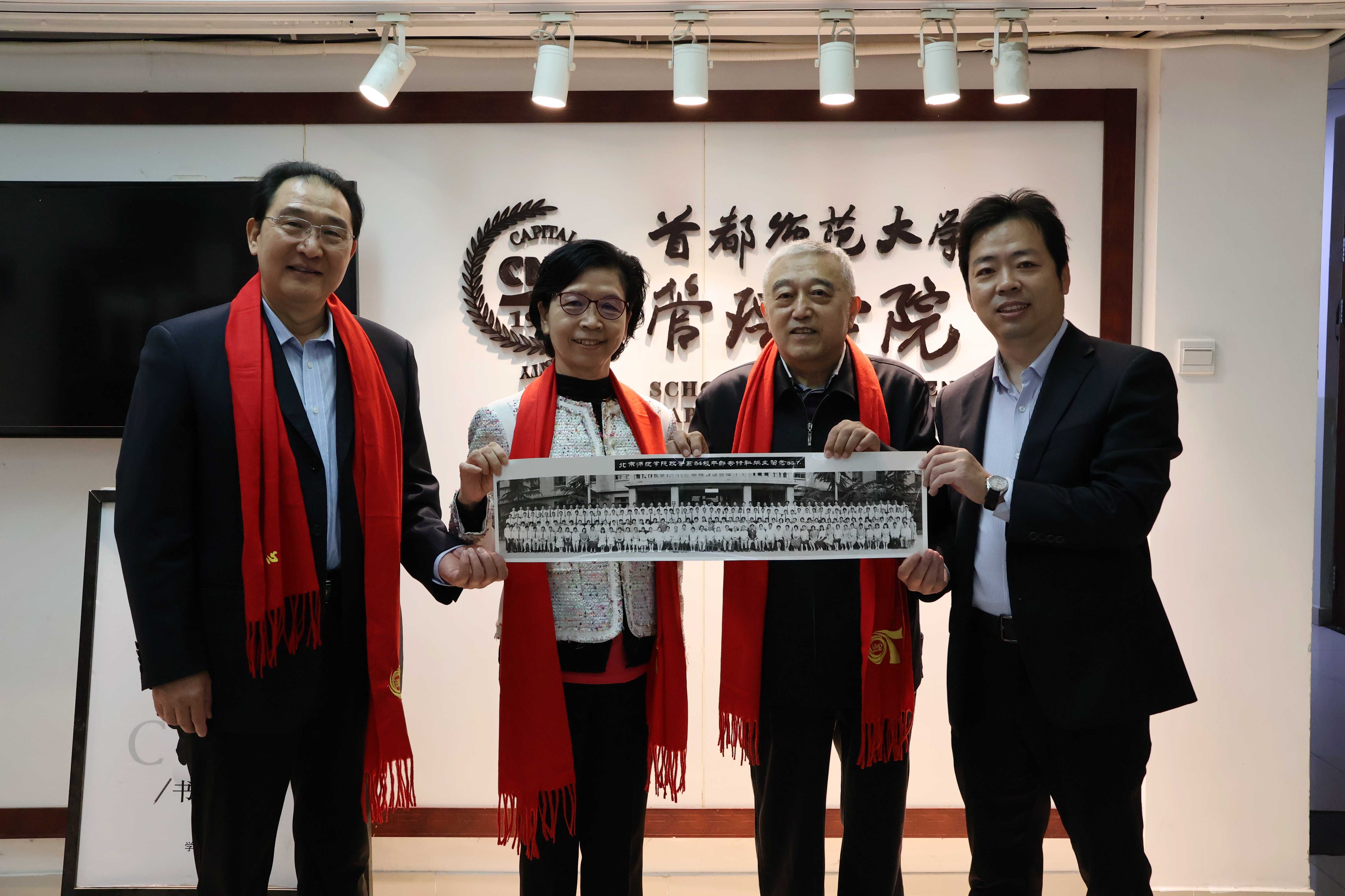 在学院两个多月的积极协调下,管理系(政管系)84级2班54名校友,以“重温校园梦 再续师生情”为主题,组织召开了“庆祝首师大70华诞师生座谈会”。与会校友朗诵了回顾当年校园生活的叙述诗,观看并合唱了在校期间获奖的合唱曲目;大家纷纷上台分享了自己的成长经历和人生感悟,重温了与班主任杨静老师的师生情谊。最后,校友们将精心制作的礼物和鲜花献给老师,并将校友创作、集体签名的画作以及珍藏多年的毕业照、花名册作为七十周年校庆献礼赠送学校。整场活动温馨、和谐、热烈、节俭,充分体现、表达了校友们对母校的深厚情感和真诚祝福。