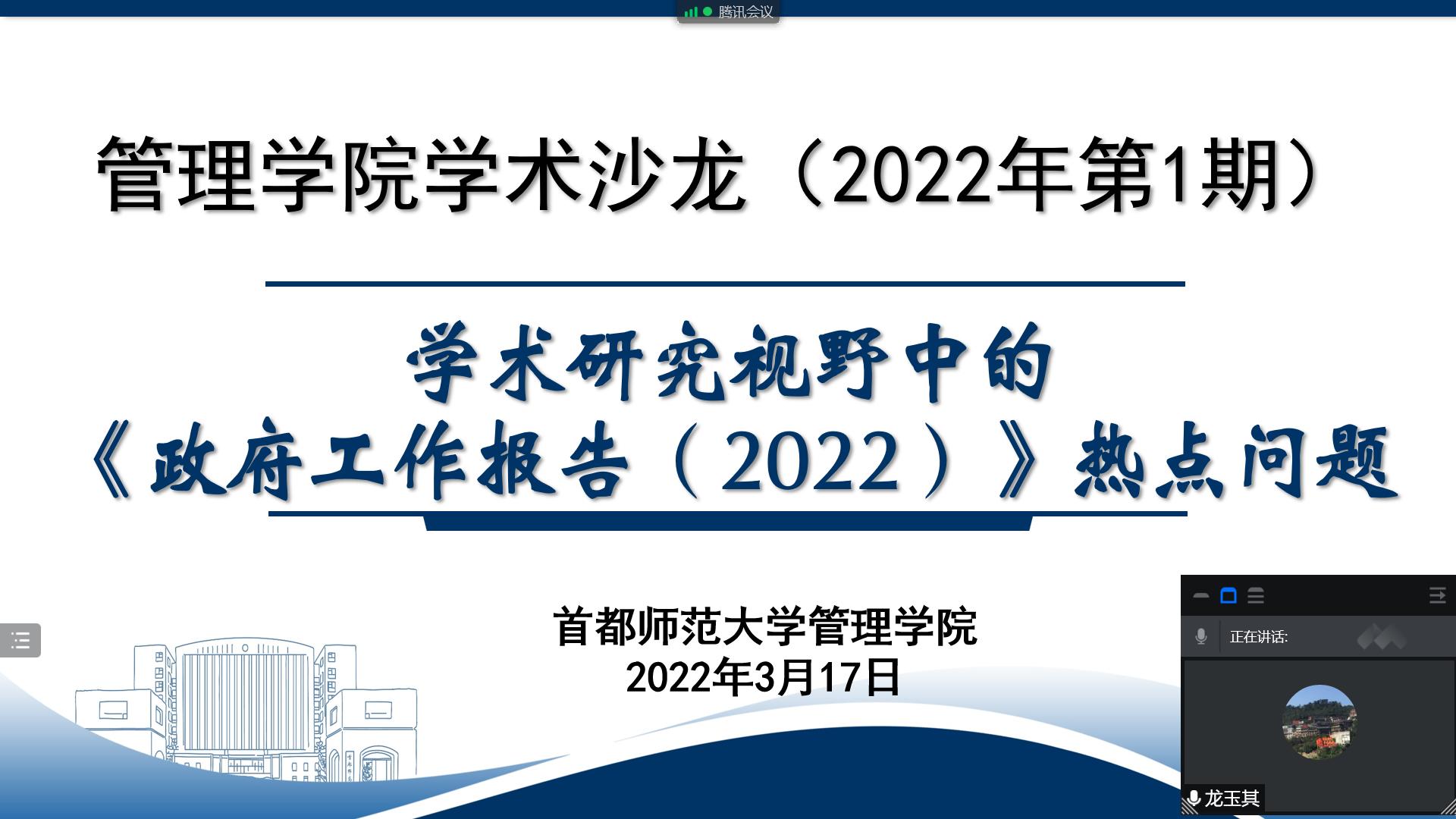 为了进一步营造良好的学术科研氛围,拓展学院教师的学术视野,加强不同学科教师之间的交流合作,促进青年教师的科研能力培养,实现学院党建与业务的深度融合,3月17日下午,太阳成集团tyc234cc官网以腾讯会议的方式举行了2022年第1期学术沙龙活动,本次学术沙龙的主题是“学术研究视野中的《政府工作报告(2022)》热点问题”。学院党委纪高峰书记、院长谢新水教授、副院长李红芸老师以及学院20多位教师参加了学术沙龙,学术沙龙由太阳成集团tyc234cc官网科研副院长龙玉其老师主持。