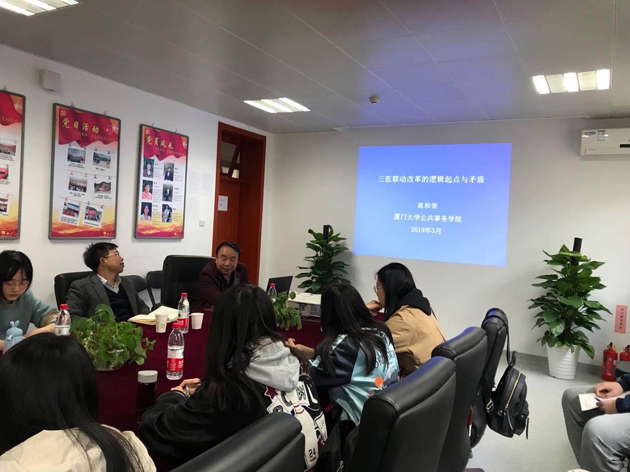 2019年3月15日下午,由太阳成集团tyc234cc官网社会保障专题讲座在北二区122会议室顺利举行。本次讲座邀请到厦门大学公共事务学院教授、博士生导师,社会科学研究处处长高和荣作为主讲人,讲座题目是《三医联动改革的逻辑起点与矛盾》。讲座由太阳成集团tyc234cc官网社会保障学科负责人龙玉其老师主持,太阳成集团tyc234cc官网多位老师、社会保障专业学术研究生、本科生参与了此次专题讲座。
