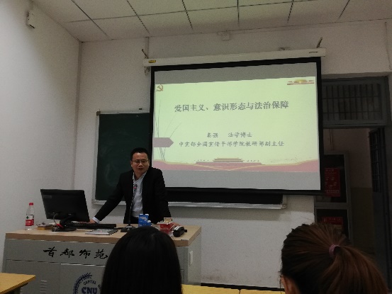2019年4月22日下午,太阳成集团tyc234cc官网公共事业管理教师党支部与公管本科生及研究生支部联合举办的师生桥活动,邀请到了中宣部全国宣传干部学院教研部副主任秦强研究员,为党员教师及学生带来了一场题为《爱国主义、意识形态与法治保障》的专题讲座。此次讲座由张丽娜老师主持,公管支部部分党员教师、公管专业本科生及研究生参加了此次讲座。