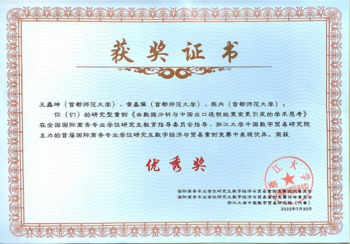 在学院的积极宣传下,国际商务专业研究生王鑫坤、聂忠闻等同学在学院周珍老师、赵成安老师和王康老师的指导下积极参加比赛,最终,凭借《环境政策是否能促进具有权力结构异质性的厂商出口》与《由数据分析与中国出口退税政策变更引发的学术思考》两篇论文获得首届“国际商务专业学位研究生数字经济与贸易案例竞赛”的优秀奖。