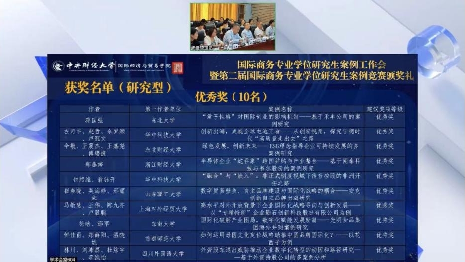 2023年6月18日,国际商务专业学位研究生案例工作会暨第二届国际商务专业学位研究生案例竞赛颁奖礼在北京举行。本次竞赛以“高水平对外开放背景下企业国际化与创新发展”为主题,在全国国际商务专业学位研究生教育指导委员会指导下,由浙江大学中国数字贸易研究院、浙江大学国际商务学科、浙江大学开放型经济与发展优势特色学科主办,中央财经大学国际经济与贸易学院、中央财经大学国际经济与贸易学院案例教学与研究中心承办。