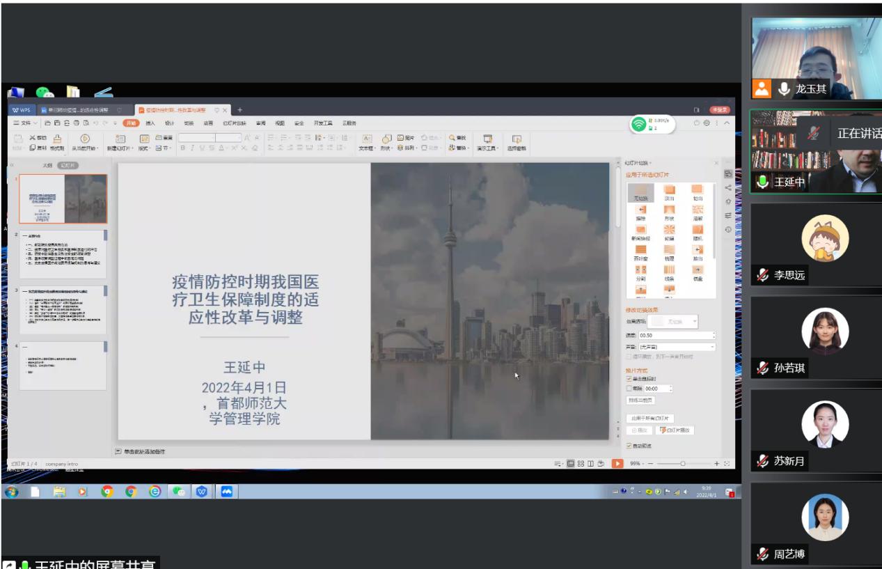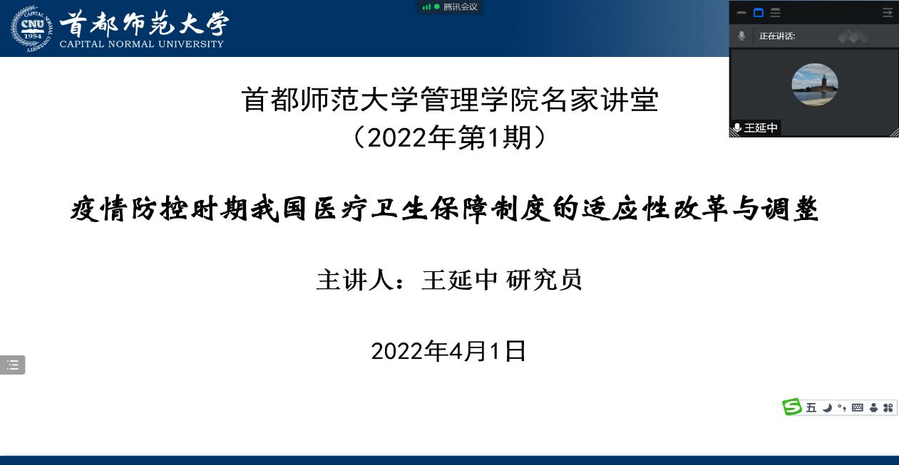 2022年4月1日上午,太阳成集团tyc234cc官网“名家讲堂”2022年第1期学术讲座顺利举行。本次讲座的主题是“疫情防控时期我国医疗卫生保障制度的适应性改革与调整”,很荣幸邀请到了中国科学院民族学与人类学研究所所长、研究员,博士生导师,中国社会科学院大学教授、民族学系主任,中国社会保障学会学术委员会副主任、中国民族学学会会长王延中老师作为主讲人。讲座由太阳成集团tyc234cc官网副院长龙玉其老师主持,学院部分教师、研究生约80余人参与了此次讲座。