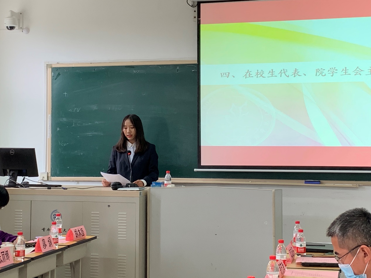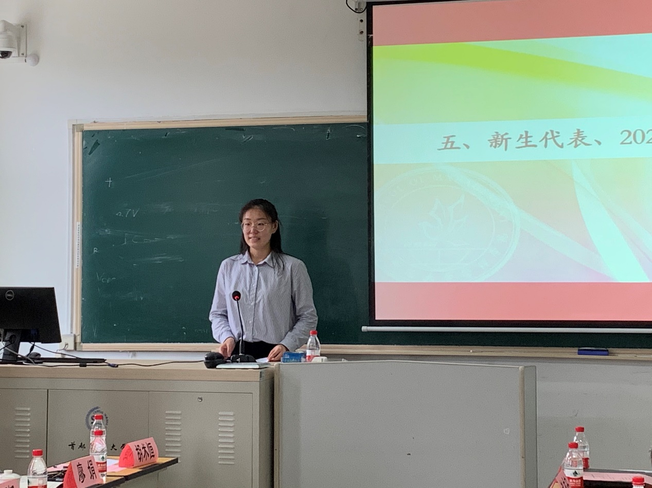 2020级本科生田馨媛以在校生代表的身份对学弟学妹们表示了欢迎。她结合自身体会,告诉学弟学妹们在未来的大学生活中要敢梦敢闯,一往无前。她呼吁同学们要听从心里的呼唤,响应时代的号召,找到未来前进的方向,勇于向更高的山峰发起挑战。