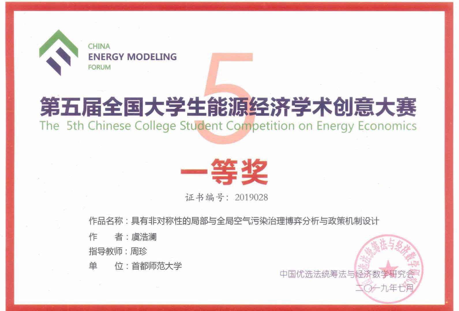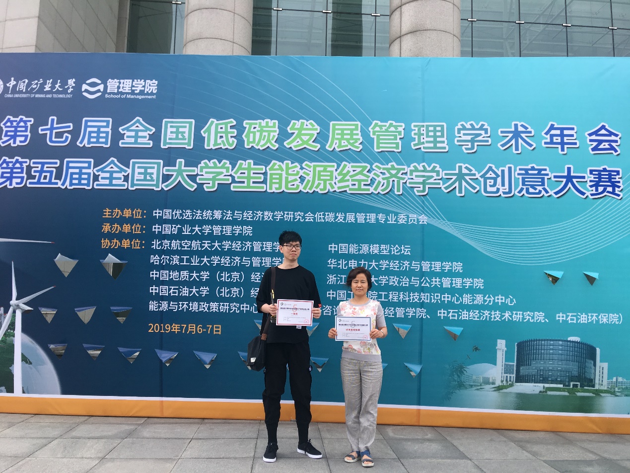 2019年7月6日,第五届全国大学生能源经济学术创意大赛决赛在中国矿业大学举行,由周珍教授指导的虞浩澜同学提交的参赛学术论文《具有非对称性的局部与全局空气污染治理博弈分析与政策机制设计》荣获本科组一等奖,并因优异表现,在论文现场答辩受到了来自中科院、清华大学等知名评委专家一致好评。